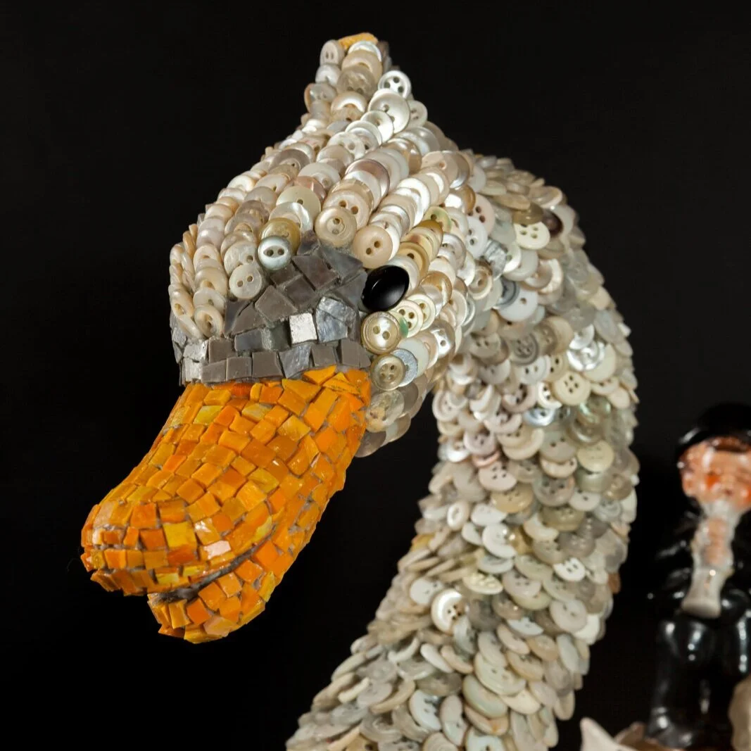 Up-cycled vintage buttons and china transform an ugly duckling swan into a fanciful musicians stage. The swans feathers get more blue at the bottom to appear as if they are in the water.
