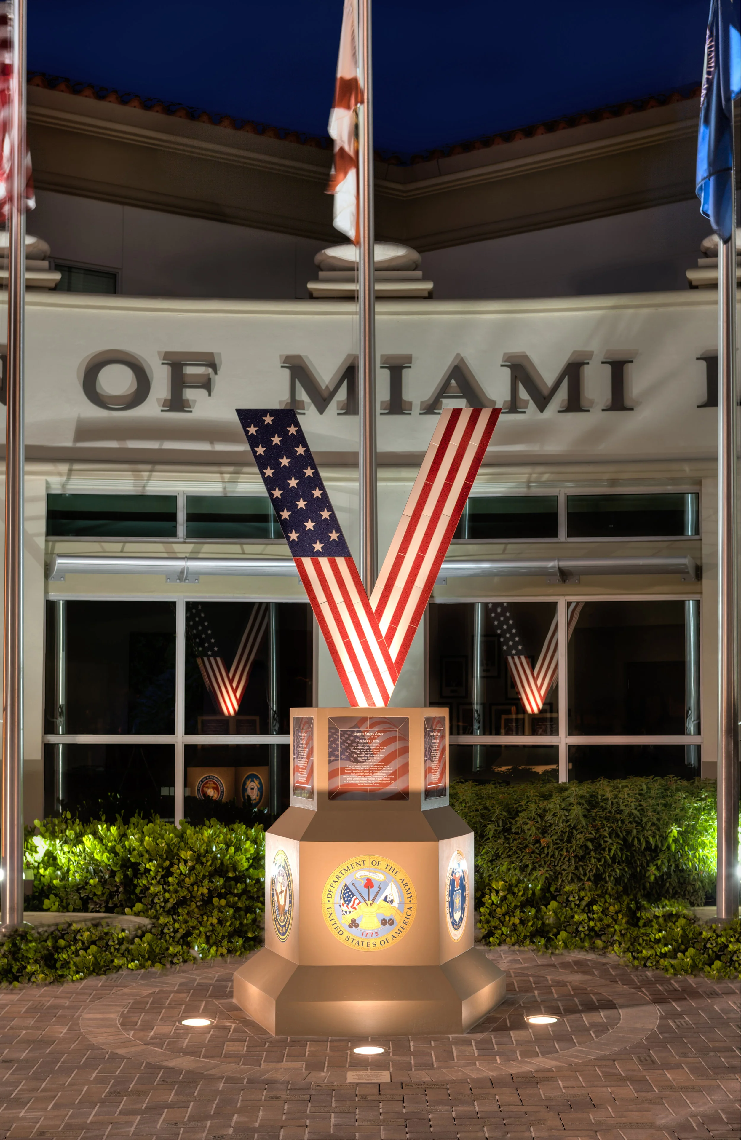 Honoring Veterans from all five branches of the United States Armed Forces this sculpture features a pentagonal base, one face per branch, and a large V for Veterans. Additionally, the V evokes the universal hand sign for victory. The sculpture is sited prominently in front of Town Hall.
